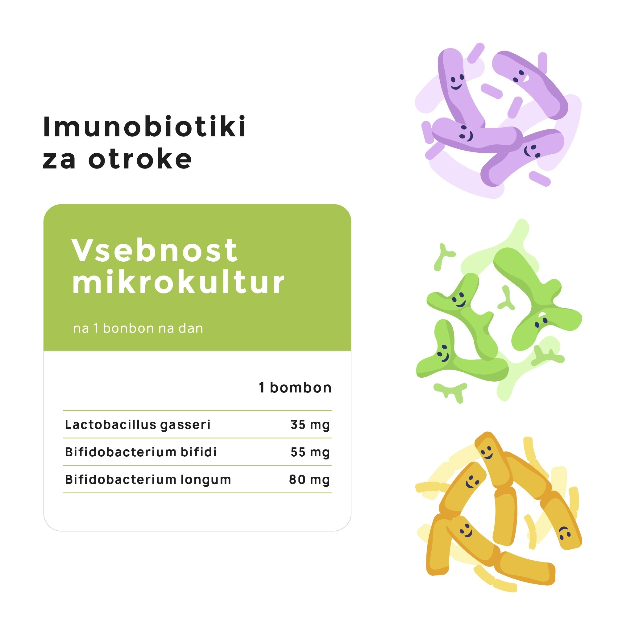 Gre za bratca Imunobiotikov za odrasle, a z mikrobiološkimi kulturami, ki so prilagojene otroškemu organizmu in v obliki, ki jo bodo otroci z veseljem pohrustali.