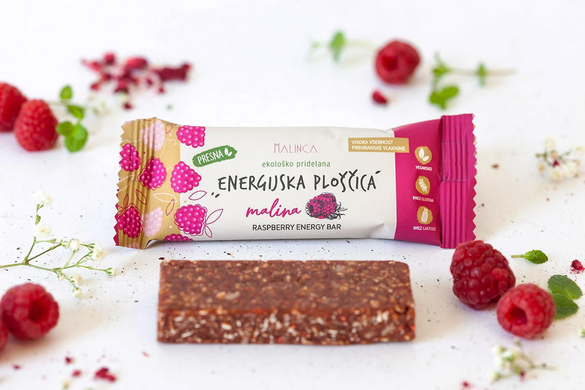 Malincina energijska ploščica malina iz ekološke pridelave je: